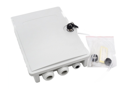 La caja de distribución IP65 con cerradura ofrece la capacidad de terminar hasta 24 fibras alojadas en una carcasa de ABS resistente y robusta para aplicaciones en interiores y exteriores.
